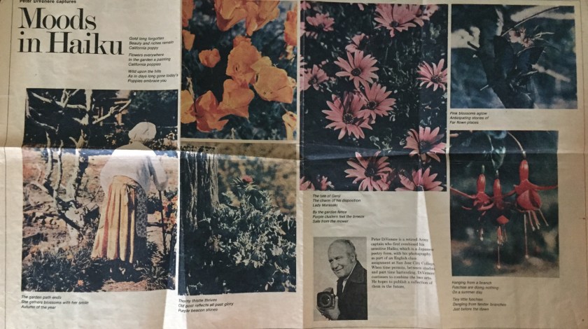 She was still tending her garden, even into her 90s, when she passed in 1974. And in the winter of 1975, an article was written in the San Jose Mercury News California Today section called “Moods in Haiku” by Peter DiVenere. He took several wonderful pictures of my great-grandmother’s garden and her tending to it, and wrote the following haiku: